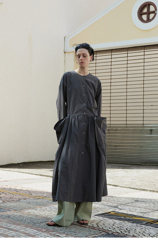 Long Staple Cotton Pleated V-Neck Short Sleeve Shirt Dress (PRE-ORDER)